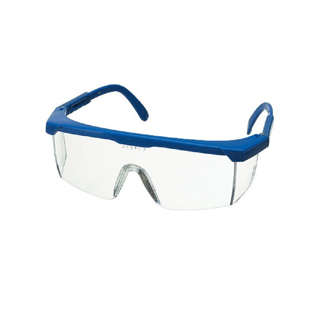 Wide vision scratch-resistant polycarbonate lens. Built-in brow guard and adjustable length arms. Colour: Clear lens, Blue frame