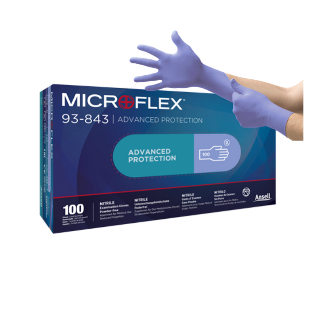Microflex® 93-843 offers advanced barrier protection against contaminants (0.65 AQL). Made with a durable nitrile formulation, this sturdy glove is ideal for long wear times and demanding jobs.