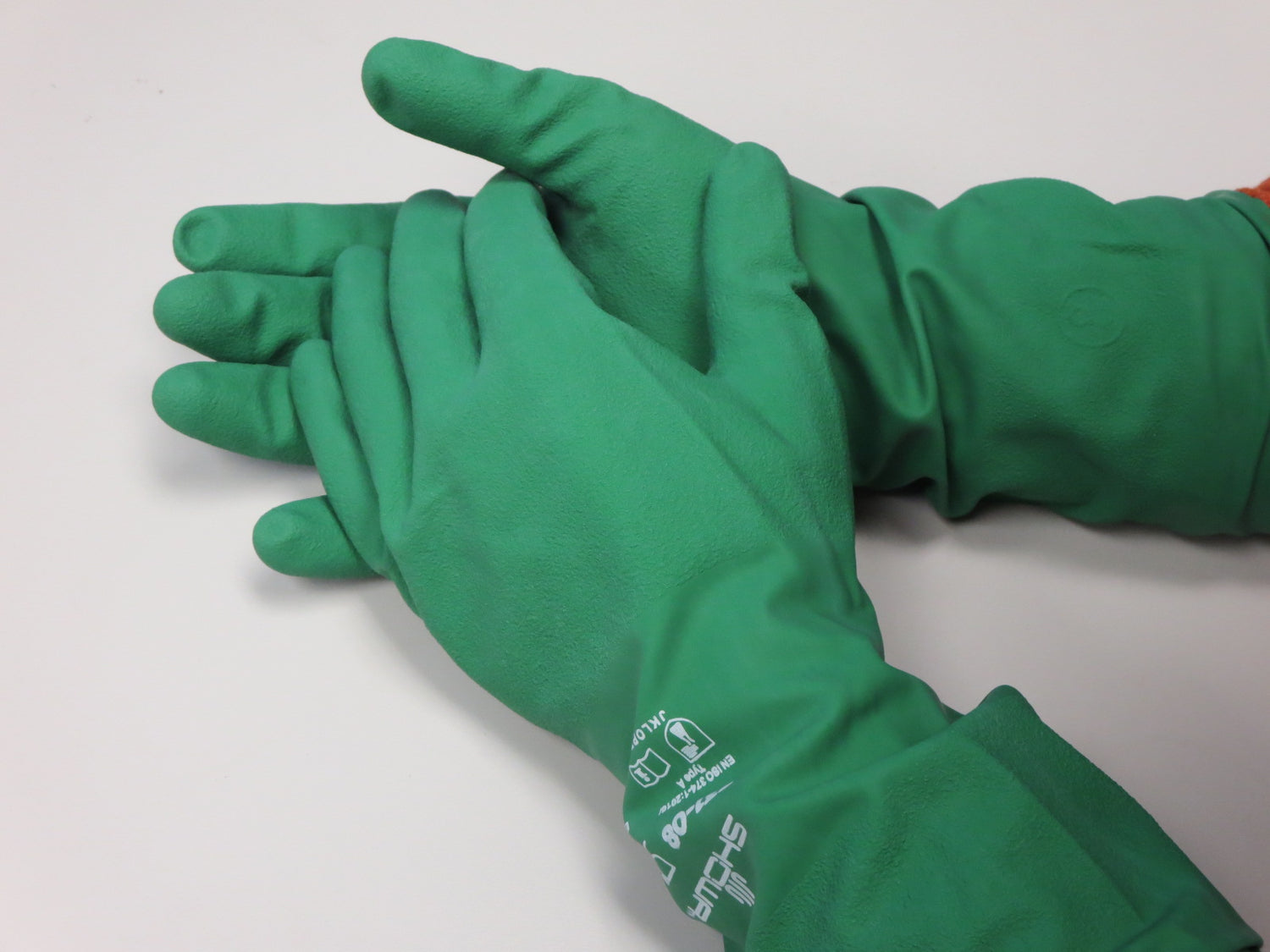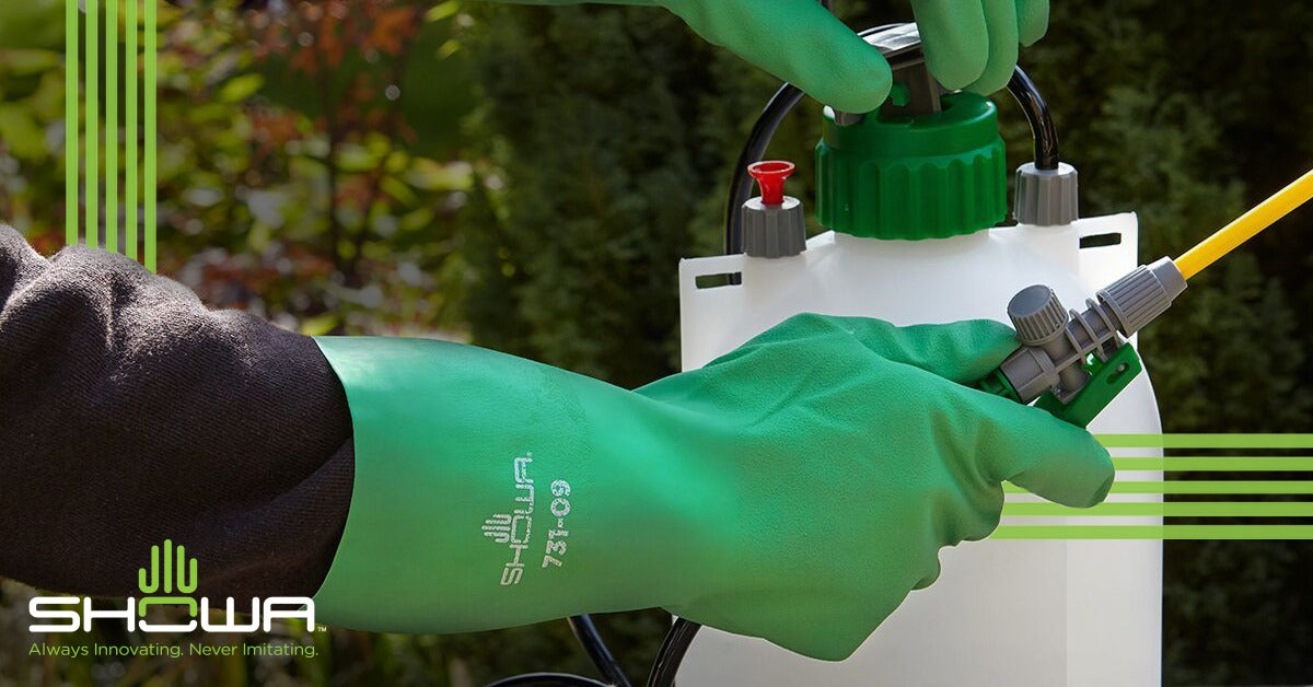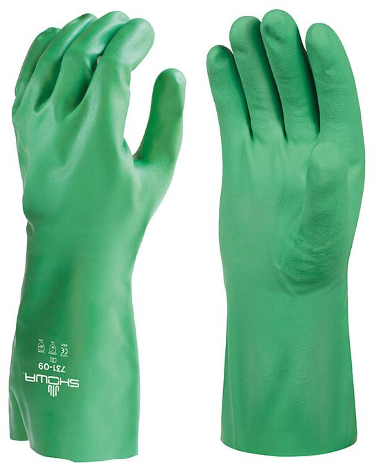 Chemical-resistant gloves, like the SHOWA 731, are ideal for working with harmful substances such as acids and solvents.